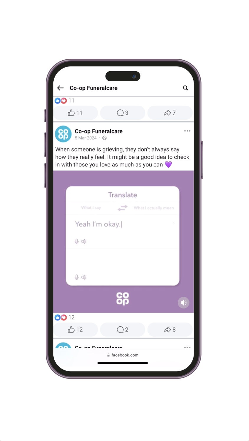 I worked on creating social assets for Co-op funeralcare. The brief was to create content for a chunk of the year, during this period I created ideas for Mother's Day, Valentines Day and also a series idea that would help translate how people are feeling. What they might say might actually mean something else. All content went on the Co-op funeralcare facebook page.